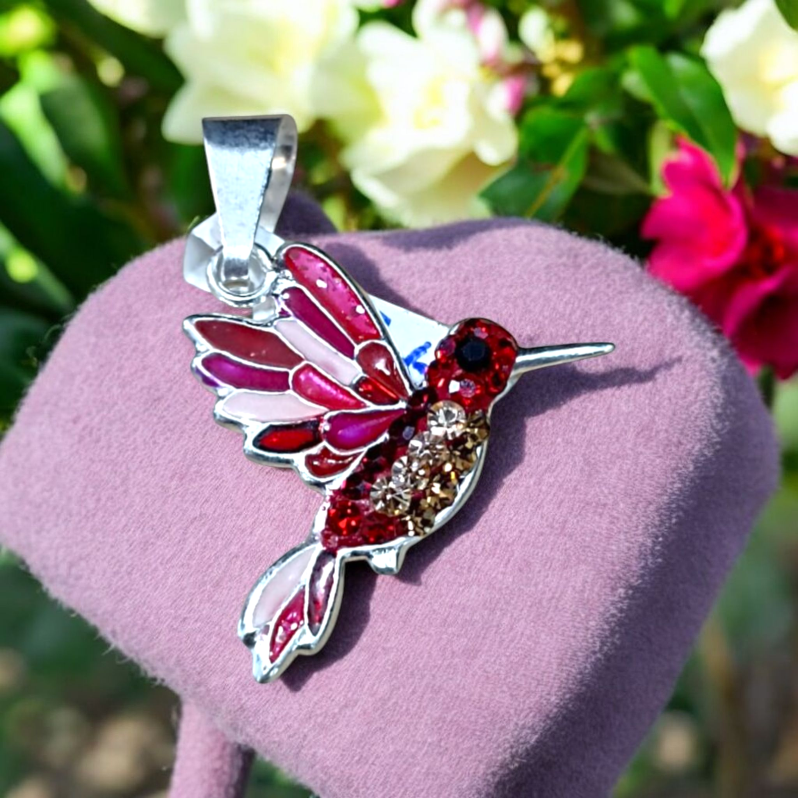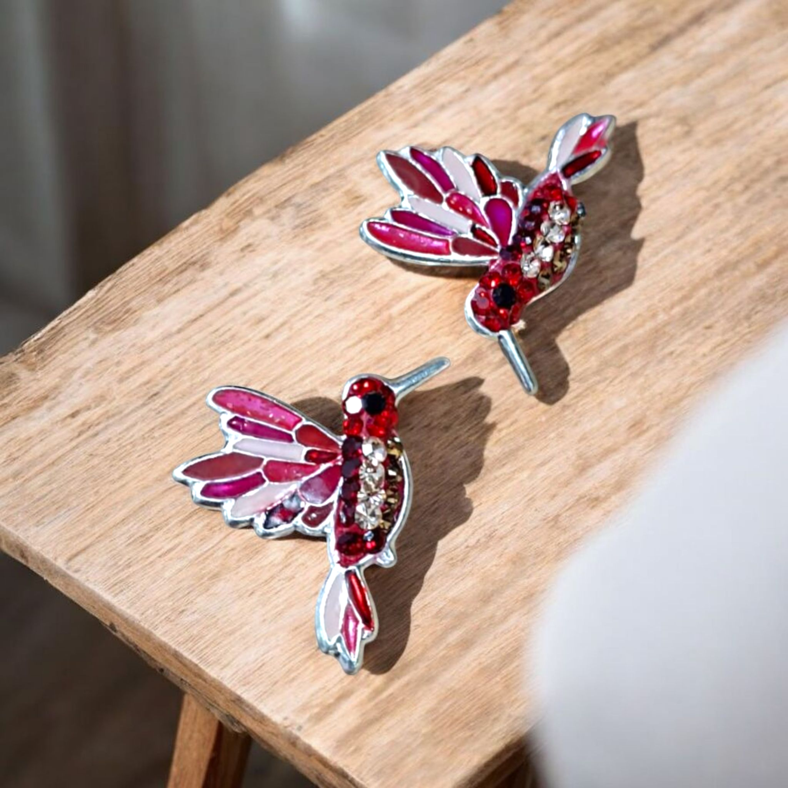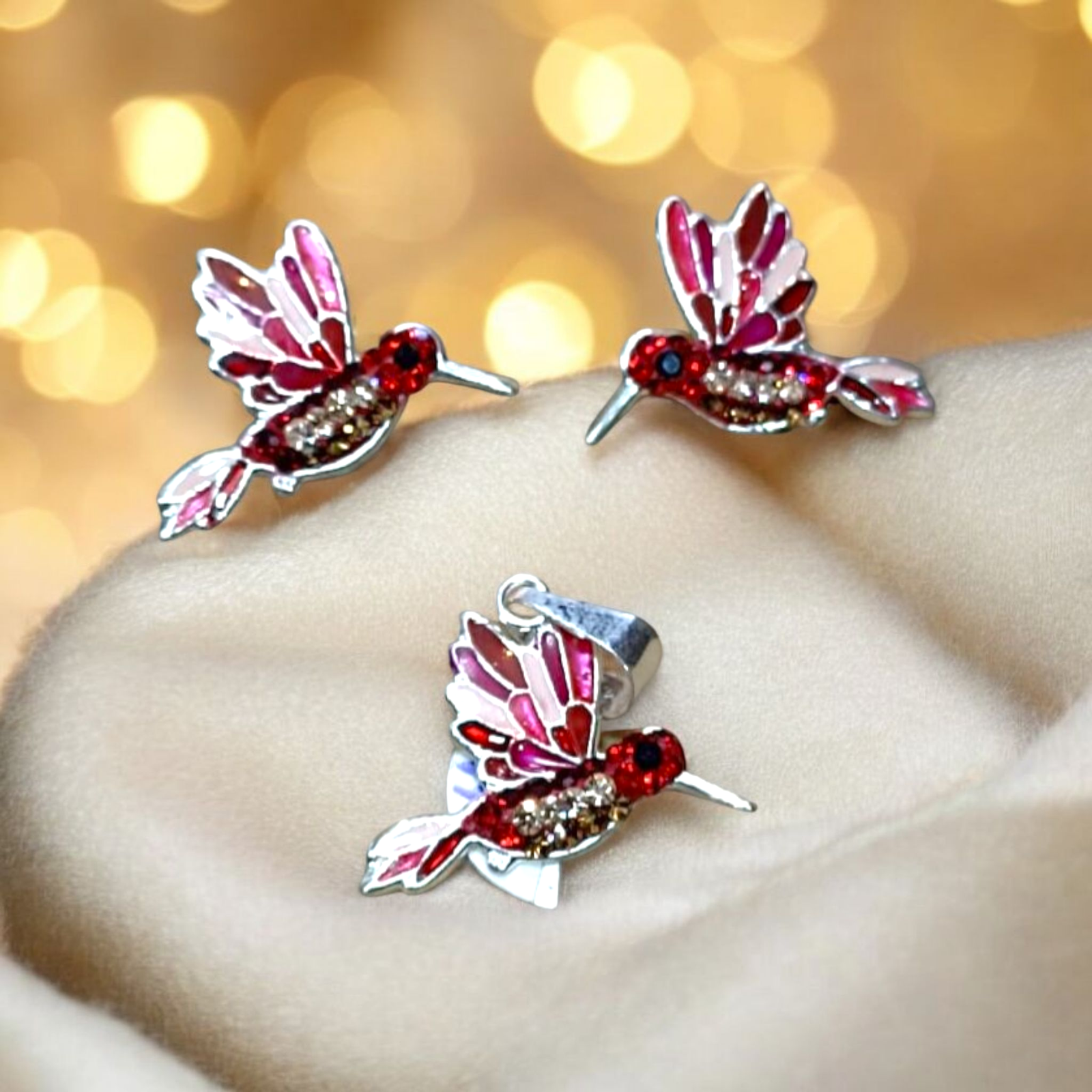 Juego de aretes con dije en forma de colibrí, detallado y esmaltado a mano. Fabricado en plata de ley. 925